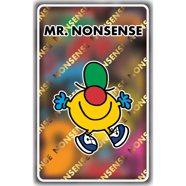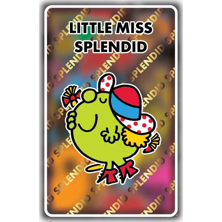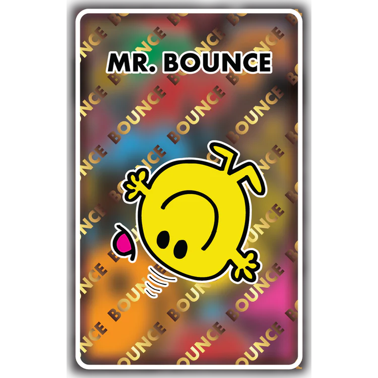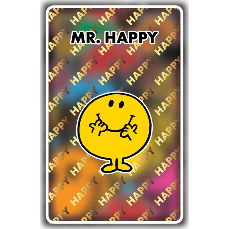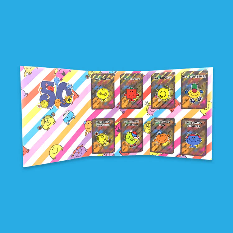 A limited edition of 8 collectible cards including: Mr. Happy, Mr. Strong, Mr. Bounce, Mr. Nonsense, Little Miss Sunshine, Little Miss Splendid, Little Miss Fun, and Little Miss Giggles.- Each set is complete with card holder + 8 collectible cards