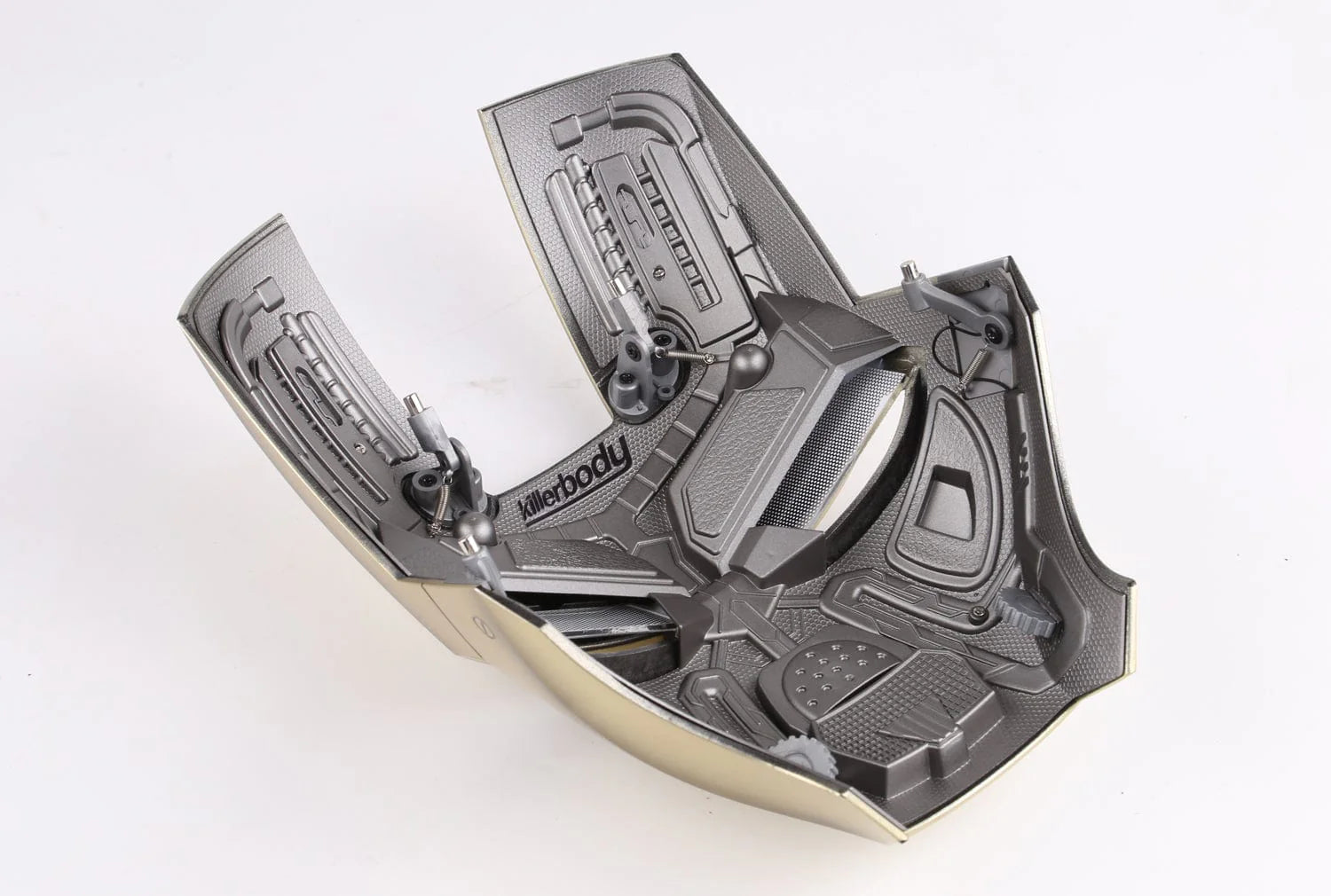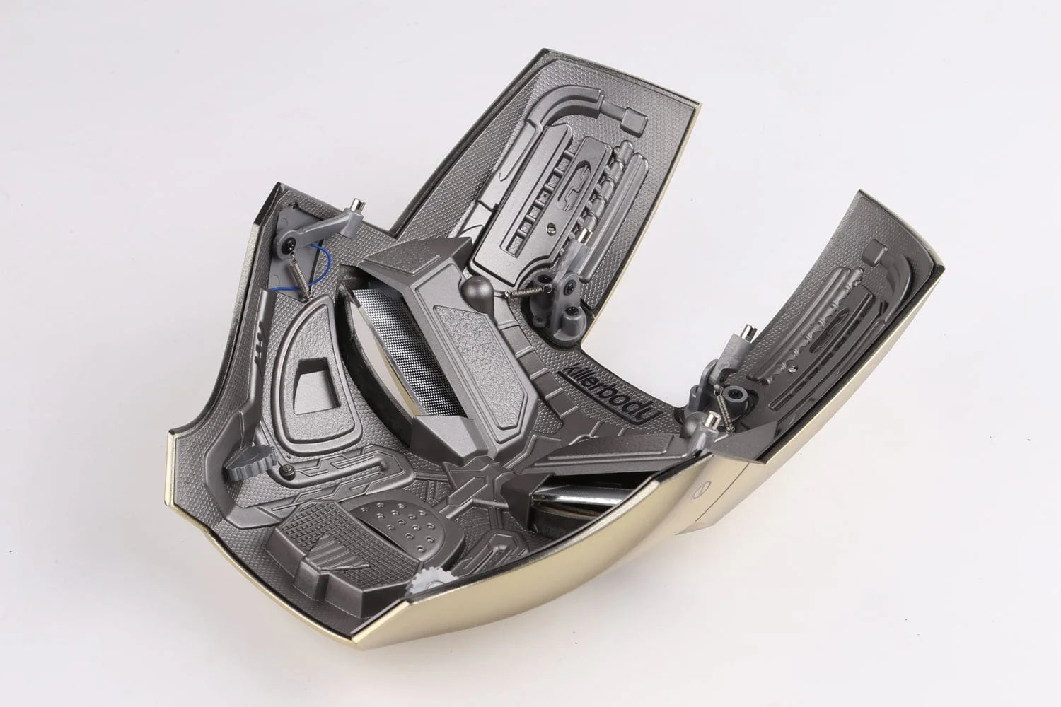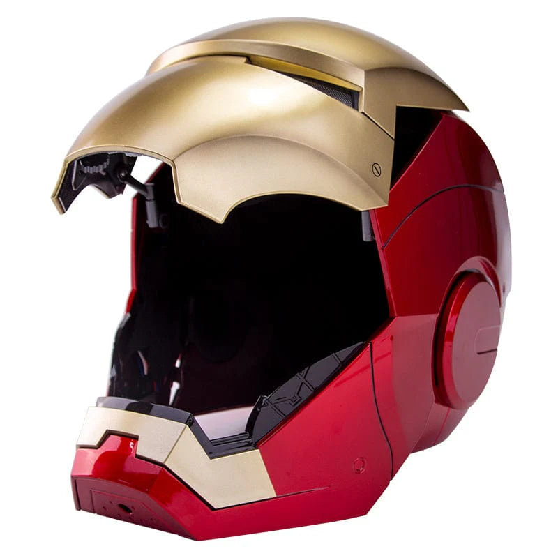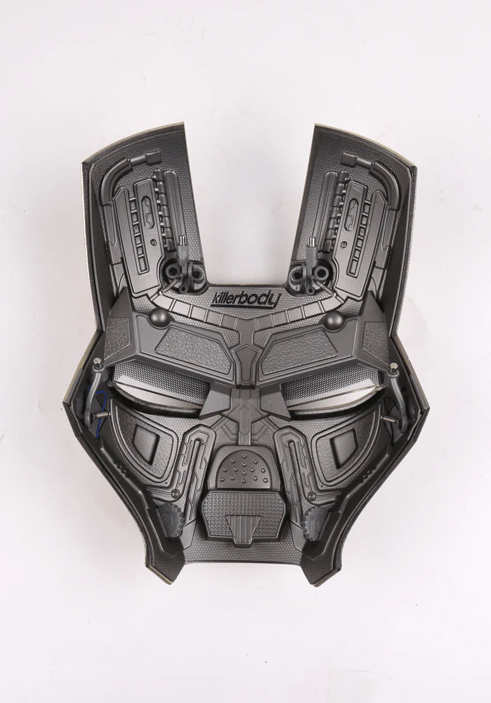 1. 可穿戴;2. 四種控制模式:中英文語音控制、觸控、2.4G遙控;3. 霧面金屬漆面面罩; 4.精細的面罩內部結構;5. 可插拔面罩;6. 透明可視鏡片(眼燈關閉時);7.立體可插拔面罩;8. 中英文語音控制/觸控/遙控眼部LED燈系統;9. Jarvis語音系統;10. 機器音效系統;11. 頭盔:4顆AAA電池;遙控器:1顆AAA電池
